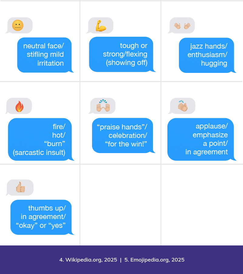 A white iPhone with a text box open at the top of its screen and a keyboard for texting at the bottom. It is held in a slim hand with manicured nails on the left side of the image. To the right are words that read:  Mastering Mobile Lingo. Mobile communications continue to grow at an astounding rate. More than half of all emails are now opened on mobile devices, either tablets or smartphones. And 95% of teenagers own a smartphone. Mobile communication is important, but what do all those acronyms mean? We’re here to help you decode the cryptic abbreviations and tiny pictures your children keep sending you.A white iPhone with a text box open at the top of its screen and a keyboard for texting at the bottom. It is held in a slim hand with manicured nails on the left side of the image. To the right are words that read:  Mastering Mobile Lingo. Mobile communications continue to grow at an astounding rate. More than half of all emails are now opened on mobile devices, either tablets or smartphones. And 95% of teenagers own a smartphone. Mobile communication is important, but what do all those acronyms mean? We’re here to help you decode the cryptic abbreviations and tiny pictures your children keep sending you.In the next section is a chart of text messages with one message using  and one response message. The chart reads: LOL, laugh out loud. HMU, hit me up. FTW, for the win. IIR, if I recall correctly. ATM, at the moment. BRB, be right back. IKR, I know, right? TBH, to be honest. JK, just kidding. RN, right now.In the next section is a chart of text messages with one message using  and one response message. The chart reads: LOL, laugh out loud. HMU, hit me up. FTW, for the win. IIR, if I recall correctly. ATM, at the moment. BRB, be right back. IKR, I know, right? TBH, to be honest. JK, just kidding. RN, right now.The chart of text messages continues with two rows of five texts. The texts read: OT, off topic. IDK, I don’t know. IMO, in my opinion. IRL, in real life. ICYMI, in case you missed it. TTYL, talk to you later. FWIW, for what it’s worth. NBD, no big deal. HBU, how ‘bout you? OMW, on my way.The chart of text messages continues with two rows of five texts. The texts read: OT, off topic. IDK, I don’t know. IMO, in my opinion. IRL, in real life. ICYMI, in case you missed it. TTYL, talk to you later. FWIW, for what it’s worth. NBD, no big deal. HBU, how ‘bout you? OMW, on my way.The chart ends with three more rows of text messages. The texts read: HBU, how ‘bout you? OMW, on my way. BTW, by the way. NVM, never mind. TY or THX, thank you. TYVM, thank you very much. YOLO, you only live once. SMH, shaking my head. FOMO, fear of missing out. NP, no problem. TIL, today I learned. DM, direct message. LMK, let me know. TL;DR, too long, didn’t read. IDC, I don’t care. OMG, oh my gosh.The chart ends with three more rows of text messages. The texts read: HBU, how ‘bout you? OMW, on my way. BTW, by the way. NVM, never mind. TY or THX, thank you. TYVM, thank you very much. YOLO, you only live once. SMH, shaking my head. FOMO, fear of missing out. NP, no problem. TIL, today I learned. DM, direct message. LMK, let me know. TL;DR, too long, didn’t read. IDC, I don’t care. OMG, oh my gosh.Next, the image is split down the middle. On the right are a series of facial emojis. The left half has words that read: Quick Emoji Guide. Emojis are small pictographic representations of emotional states, transportation methods, and locations, developed in the 1990s by NTT DoCoMo, a Japanese communications firm. There are hundreds of emojis available for you to convey your thoughts. Here’s a quick guide to a few of the most popular (and esoteric) emojis you may encounter...Next, the image is split down the middle. On the right are a series of facial emojis. The left half has words that read: Quick Emoji Guide. Emojis are small pictographic representations of emotional states, transportation methods, and locations, developed in the 1990s by NTT DoCoMo, a Japanese communications firm. There are hundreds of emojis available for you to convey your thoughts. Here’s a quick guide to a few of the most popular (and esoteric) emojis you may encounter...The next section consists of a chart with two rows of boxes. These boxes contain emojis and a response text that explains what the emojis mean. They read: Smiley face with blushing cheeks, happy. Laughing face with tears, laughing so hard I’m crying. Face with a wide straight mouth showing teeth, nervous or awkward. A face with small eyes and a small downturned mouth, disappointed or sad. A face with one tear and a sad mouth, crying or very sad. A face with tears streaming down and an open mouth, weeping. A wide-eyed face with an open mouth, embarrassed or surprised. A face with small eyes and a small flat mouth, confused or concerned. A face with small eyebrows and a small mouth, unamused or annoyed. A face with wide eyes with pupils at the top of the eyes as if looking up, and a small neutral mouth, eye roll.The next section consists of a chart with two rows of boxes. These boxes contain emojis and a response text that explains what the emojis mean. They read: Smiley face with blushing cheeks, happy. Laughing face with tears, laughing so hard I’m crying. Face with a wide straight mouth showing teeth, nervous or awkward. A face with small eyes and a small downturned mouth, disappointed or sad. A face with one tear and a sad mouth, crying or very sad. A face with tears streaming down and an open mouth, weeping. A wide-eyed face with an open mouth, embarrassed or surprised. A face with small eyes and a small flat mouth, confused or concerned. A face with small eyebrows and a small mouth, unamused or annoyed. A face with wide eyes with pupils at the top of the eyes as if looking up, and a small neutral mouth, eye roll.This section contains two new rows of emojis with text explanations. They read: A face with closed eyes, an open mouth, and slee